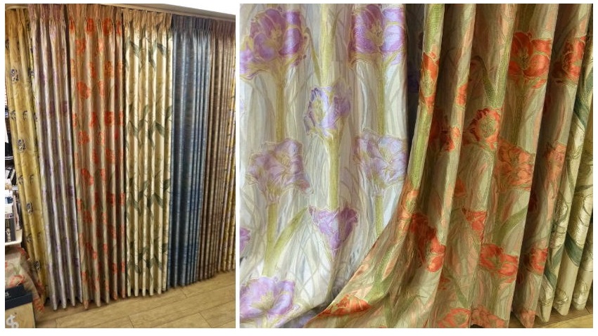 室内照明がない状況での撮影ため、カーテンが持つ夜間の表情を十分にお伝えできませんが、照明を受けて柔らかな輝きを放つ『キタリア』の生地の魅力とパターンの美しさをお客様には末永くお楽しみいただけることと思います。