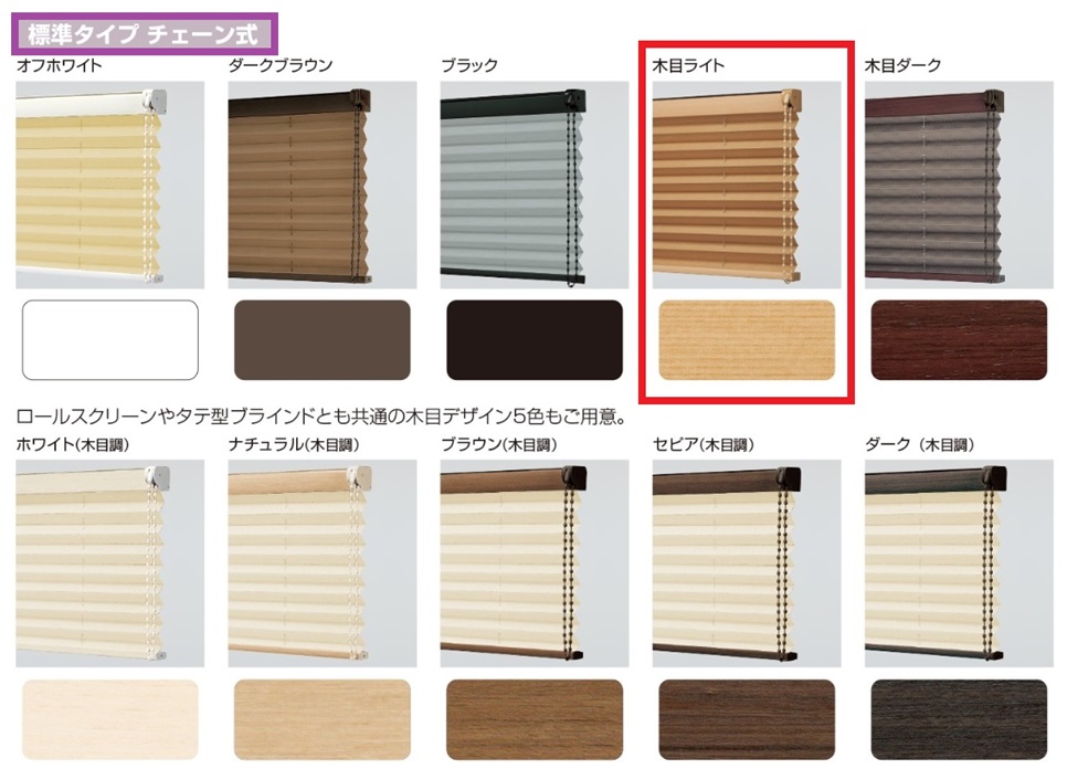 和室の窓回り品として人気のある「プリーツスクリーンでは、木目調のヘッドレールが充実しており、お部屋の内装や組み合わせる生地のイメージに合わせて全10配色からお選びいただくことができます。