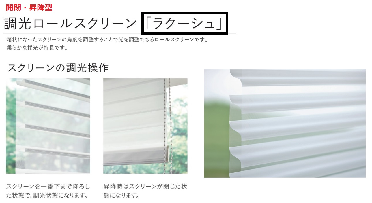 トーソー『Locouche(ラクーシュ)』は、立体的かつ柔らかな生地の角度を調節して光をコントロールする、開閉・昇降型の「調光ロールスクリーン」です。
