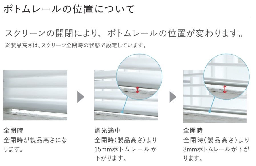 ちなみに『ラクーシュ』の場合、オーダー時の製作高はスクリーンが全閉状態で降りてきて、最下位置でスクリーンが開き始める直前のサイズとしており、その位置から調光途中にスクリーンが最大15mm下がり、スクリーンが全開になる状態は、全閉時(=発注高)より8mm下がった位置にになります。