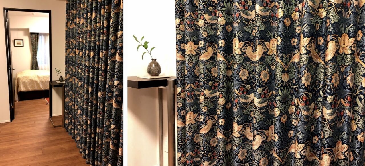過去の納品で、隣室となる寝室にウィリアム・モリスの1番弟子、ジョン・ヘンリー・ダール作の『ブラックトーン(1892年作)』をご採用いただいていたこともあり、リビング窓でのご希望はやはりモリス作品を使ってみたいとのこと。