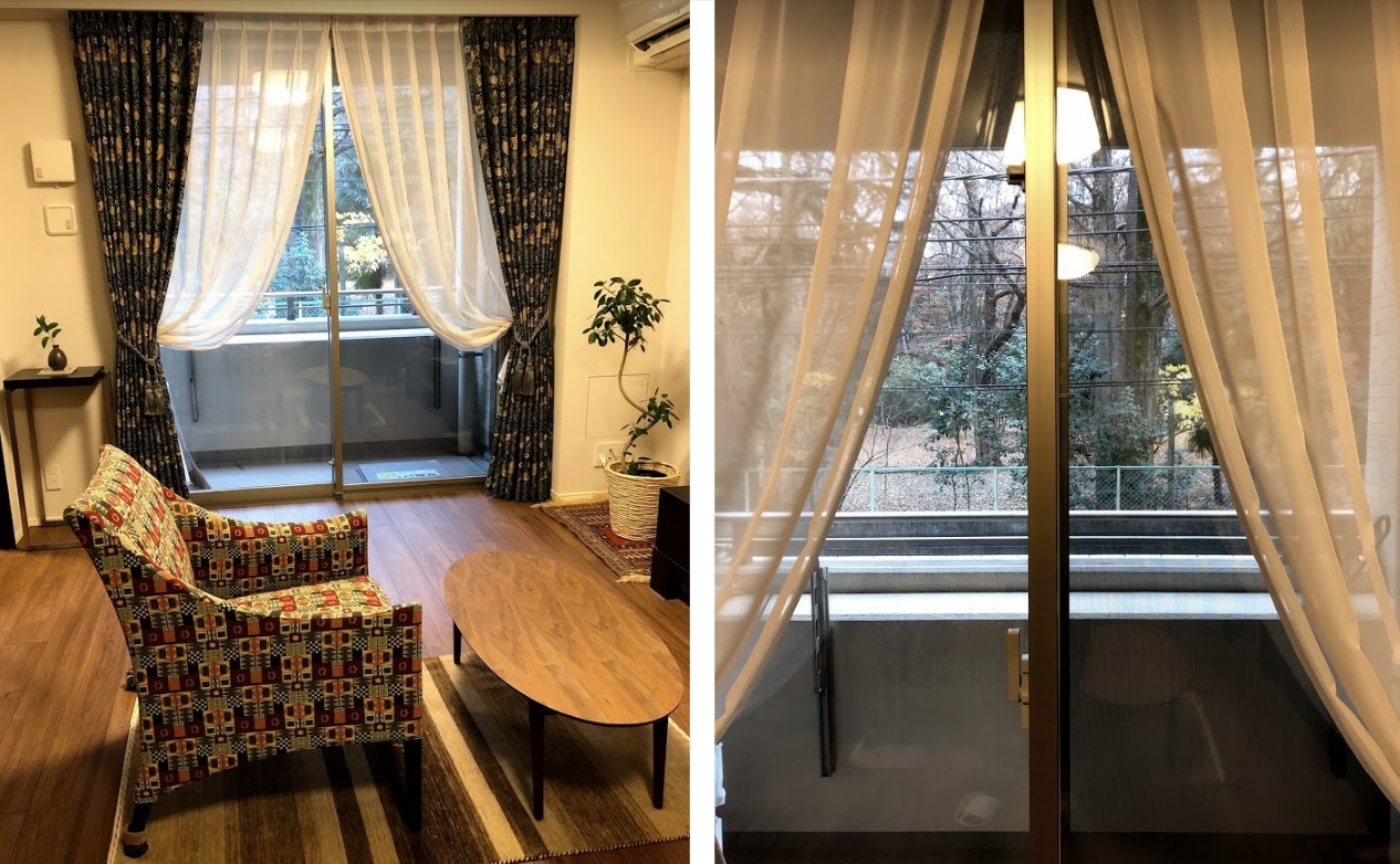ご入居当初、白系のカーテンを仕立てられたリビングの掃出窓は、ベランダから豊かな公園の木々をのぞめる開放的な眺望でしたが、数年間の生活の中で、この窓に深みのあるクラシック調のファブリックを合せてみたくなったというご相談をいただきました。