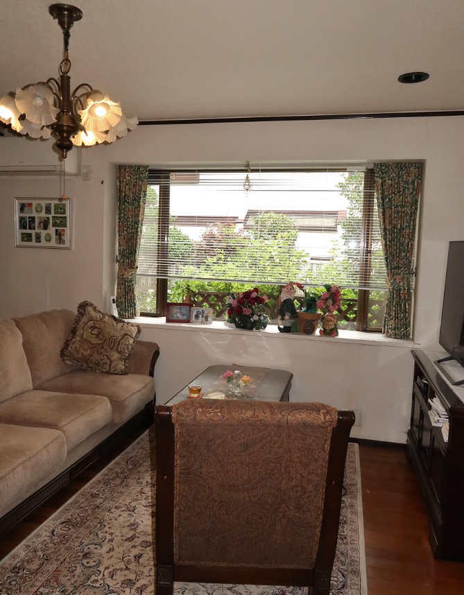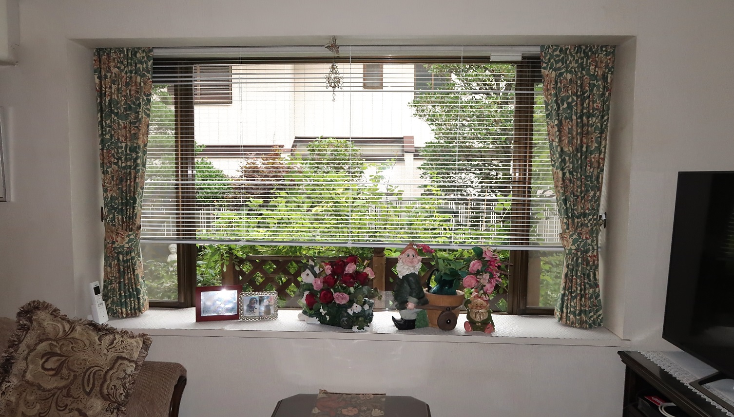 こちらの写真は、リビング・ダイニングの計3箇所のうち、美しいお庭を望むリビング側の出窓の様子で、当初のご相談は、ブラインドの手前に掛けていた古い編みレースを新調したいというものでした。