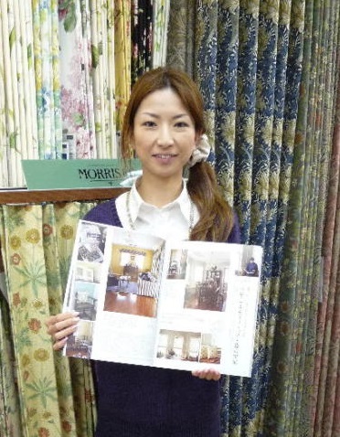 実際の納品では、リビングの、4つの窓を飾る主役のファブリクスに、紺地の『Chrysanthemam(クリサンティマム)』を採用。