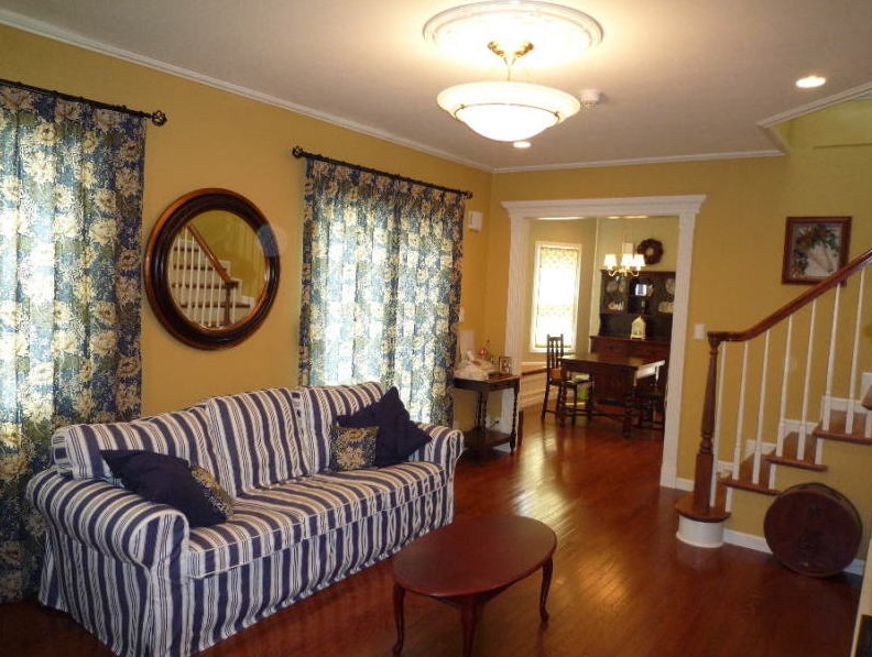 お手持ちのソファの色に加え、やや明るめのイエロー系の壁装、ホワイトの輸入建材、赤茶のフロア、家具との調和を考え、日常生活の落ち着きの中にも活気のある英国調インテリアにコーディネートさせています。