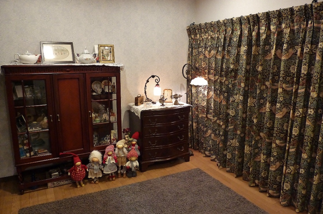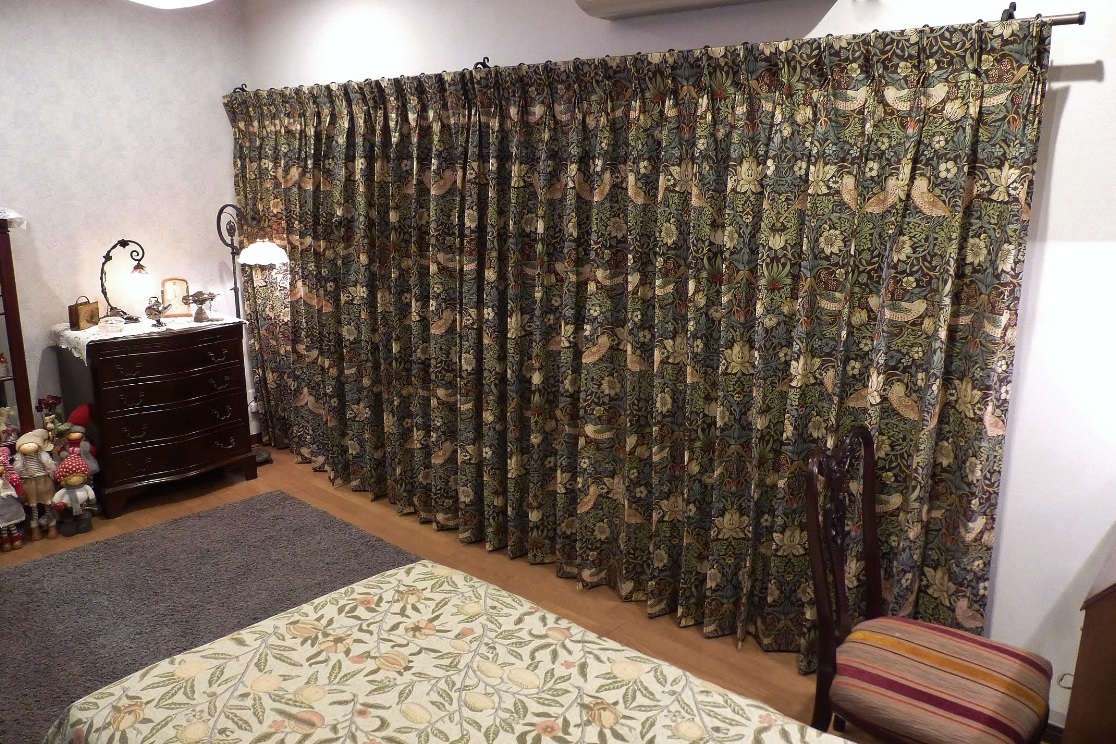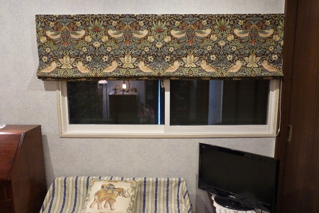 先頭のヒダ畳みの背後に、下部のヒダが隠れる様な納まりが可能であったため、ローマンシェードを引き上げた際に窓の「上飾り」の様なイメージで横一列に並ぶ「ムク鳥と苺」のパターンを楽しむことができました。