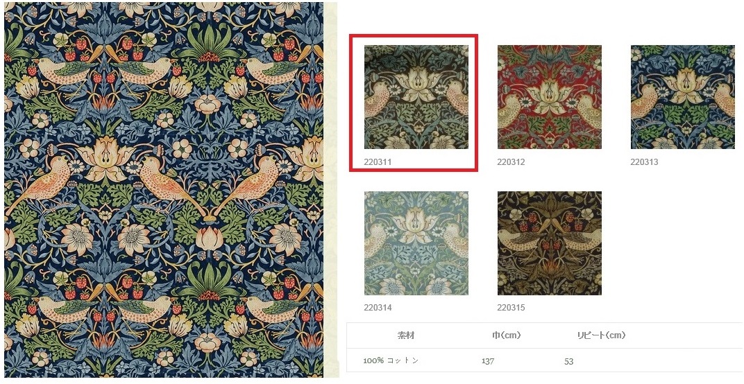 当社でリクエストが多い、ウィリアム・モリスの『イチゴドロボウ』をメインアイテムに据えたコーディネートをご採用いただきました。