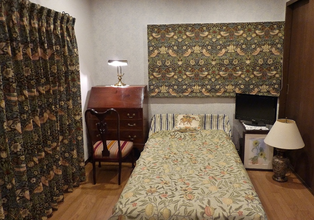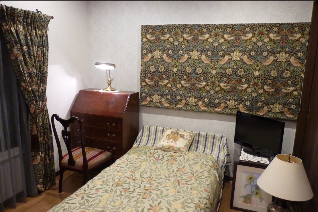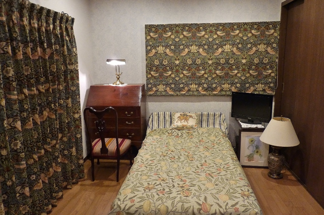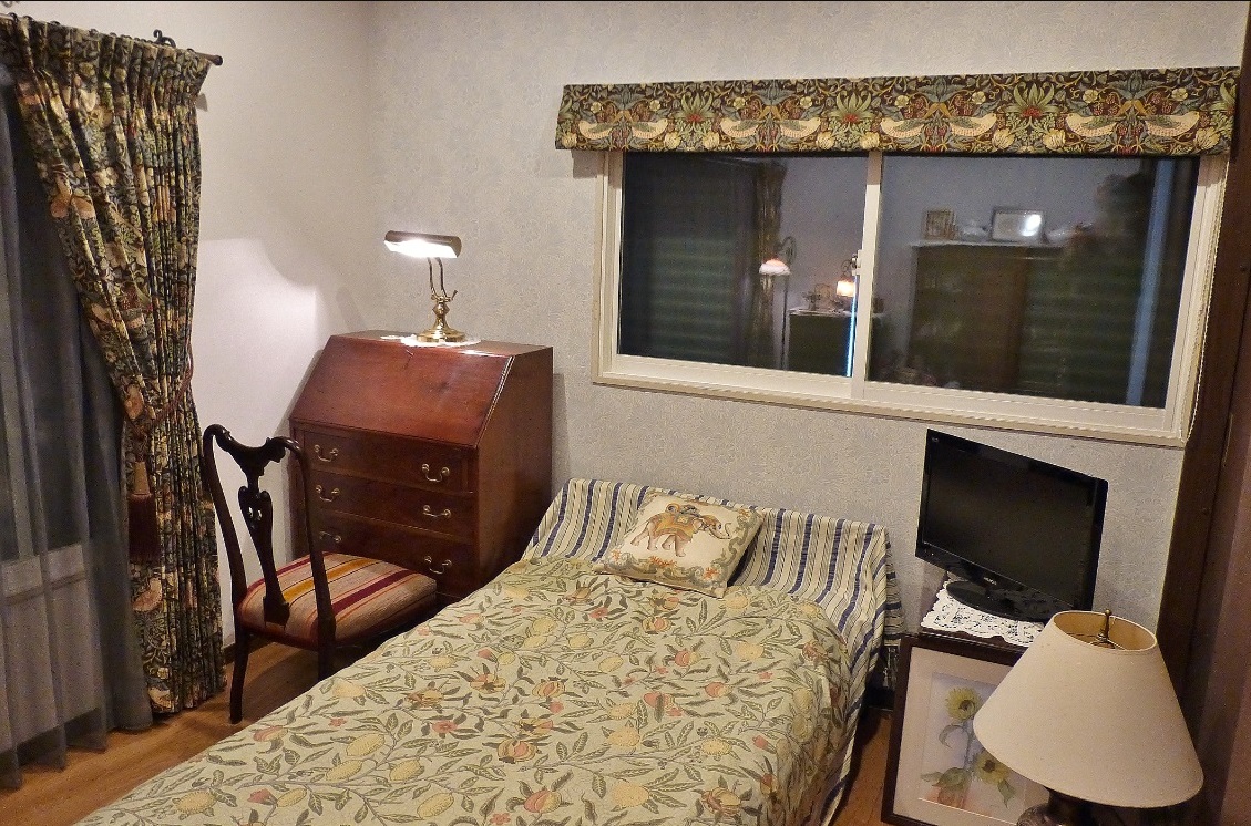 ベットの背後にあたる「腰高窓」のローマンシェードでは、上部「柄指定」を行い、『イチゴドロボウ』を「ローマンシェード」で納めています。