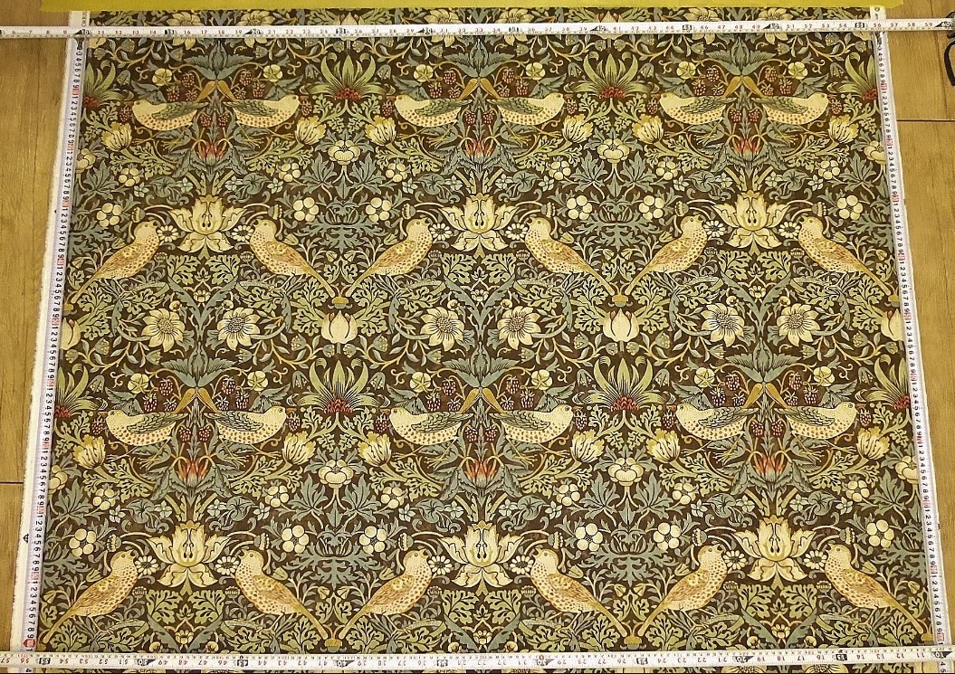 モリスが作品を手掛けるにあたって、複数の鳥の中より、愛らしい「ツグミ」に特定してデザインし、 小鳥と花、苺という、前面に表出るされる図柄の後ろに、青い森が佇んでいるという、ウィリアム・モリス独特のユートピアが感じられる作品となっています。