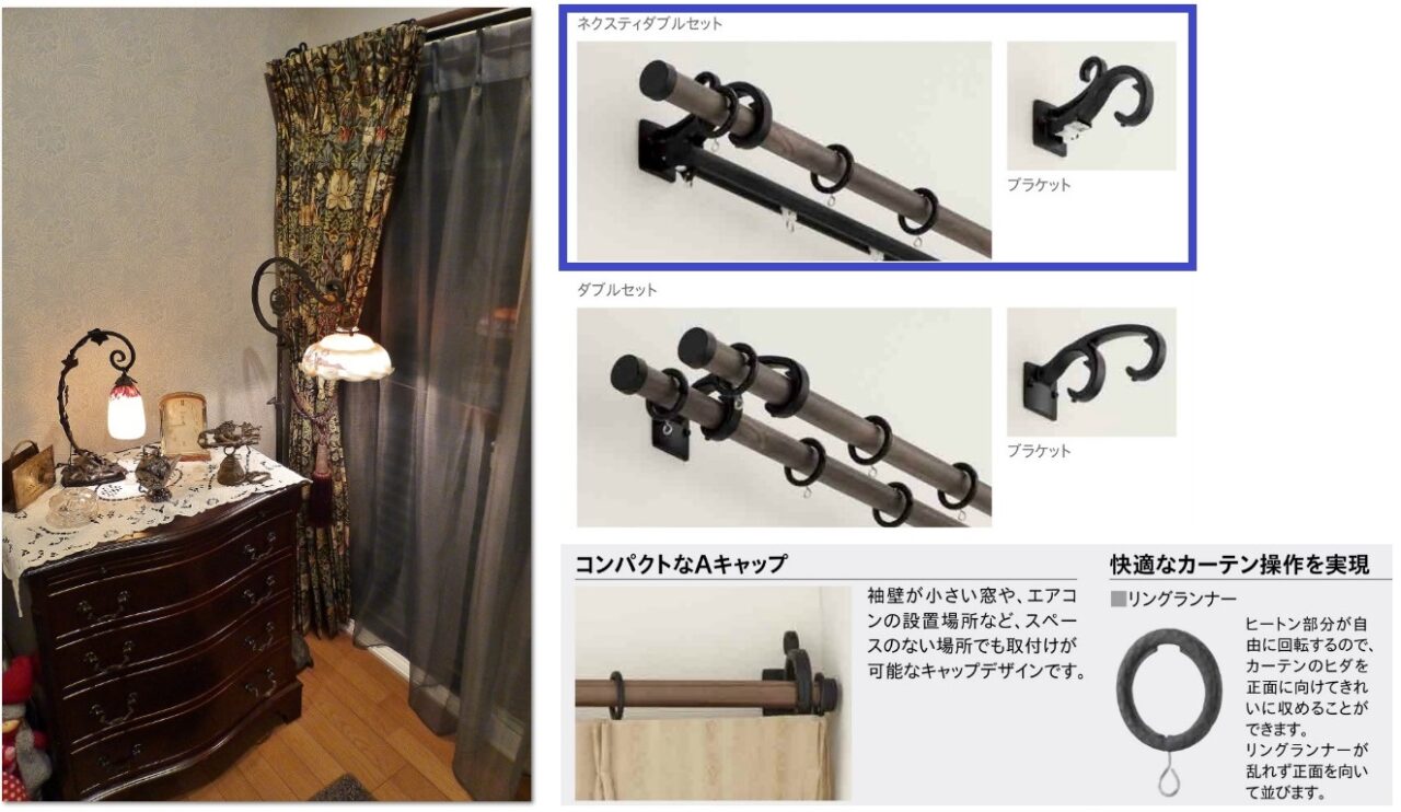 装飾カーテンレール『ルブラン22』の場合、ダブルポールセットにしてしまうと、ブラケットの形状が変わってしまい、デザインの魅力が半減してしまいます。