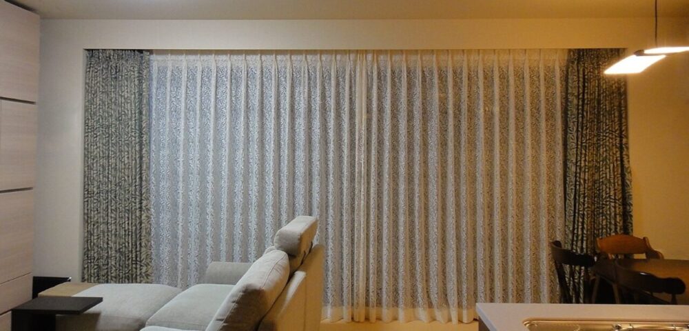 「掃出窓」の縦繋ぎ・『デュオ・スタイル』のカーテンには、「遮光裏地」を付けています。