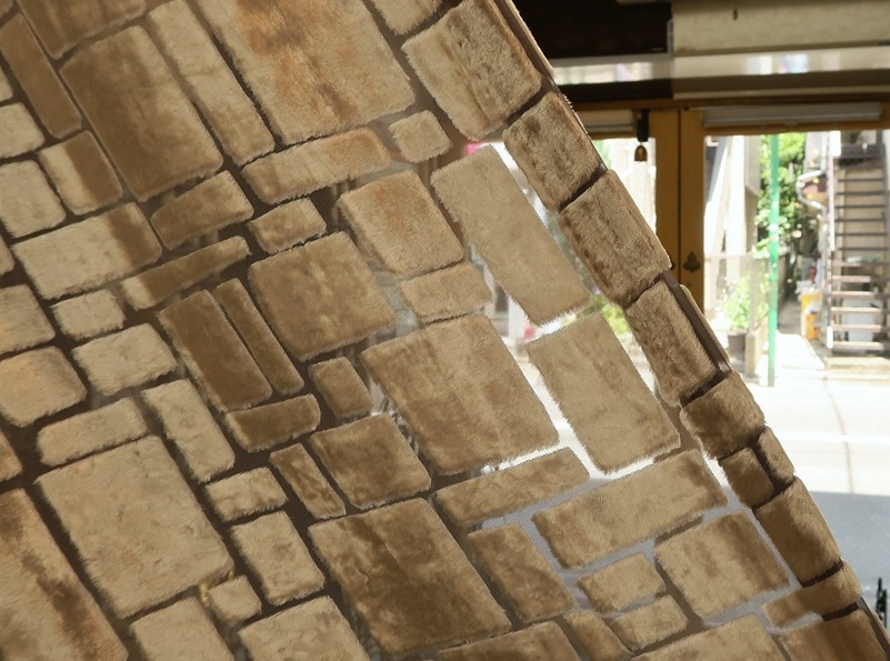 細やかなスクエアの意匠は、毛の流れをランダムにしており、光の当たり方によって生地の表情に変化が生まれます。