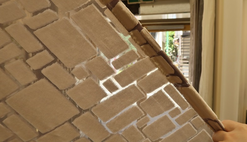 柄の隙間は透け感のあるレース地となっているデザインのため、光りを採り入れる1枚掛けとしてはもちろん、部屋の「間仕切り」としてもお使いいただける、個性的なテキスタイルです。