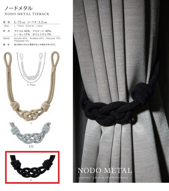 カーテンをまとめるタッセルには、しっかりとした存在感と上品な光沢を持つ、マナトレーディングの『ノードメタル』のブラック色をコーディネートして、ロートアイアン製の階段手摺りとの調和を図っています。