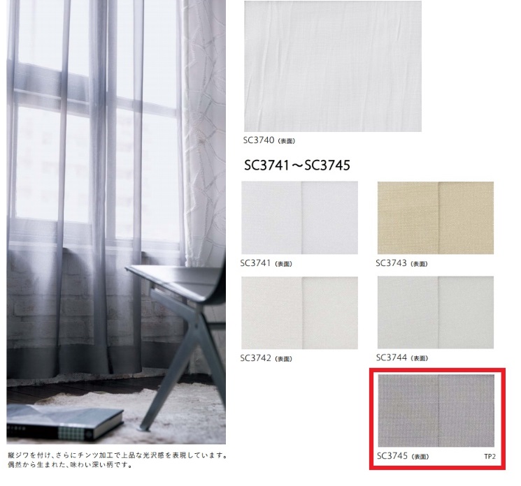 そして、『タゴト』の後幕となるレースには、生地の持つ自然な縦じわにチンツ加工で表現した上品な光沢感をミックスさせた、カラーレースより「グレー」色を組み合わせて、重なり合う複雑な採光と陰影を楽しめるスタイリングをイメージしました。