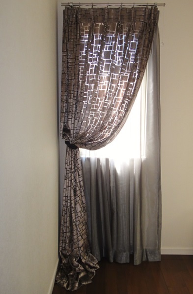 お客様からいただいたご要望は、もっぱら開閉をしない窓を、生地の持つ風合いと柄の美しさ、そしてドレッシーな印象となる「ブレイク」スタイルの組合せでエレガントな飾り窓に仕立てたいというもの。