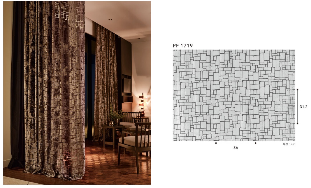 柄の隙間は透け感のあるレース地となっているデザインのため、光りを採り入れる1枚掛けとしてはもちろん、部屋の「間仕切り」としてもお使いいただける、個性的なテキスタイルです。