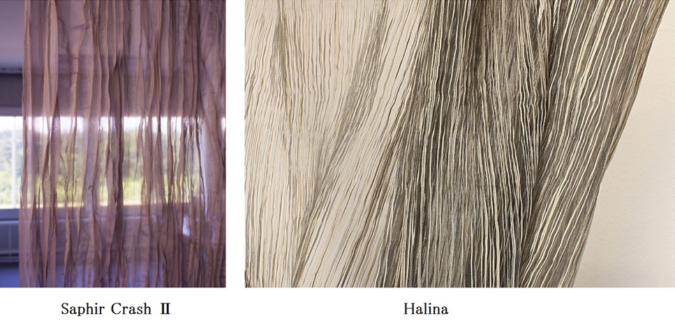 第1回目(6/1)のブログでは、「バウマンの顔」と言われるレース、 ⇒ 『SOPRANOⅢ(ソプラノ Ⅲ)』 のご紹介をさせていただきましたが、第2回の本日は、窓辺を飾るレースとしての用途はもちろん、繊細な表情で空間をセパレートする間仕切りレースとしての評価も高い、『Saphir Crash (サファイアクラッシュ )』 [写真左] と 『Halina(ハリナ)』 [写真右] の2アイテムをご紹介いたします。