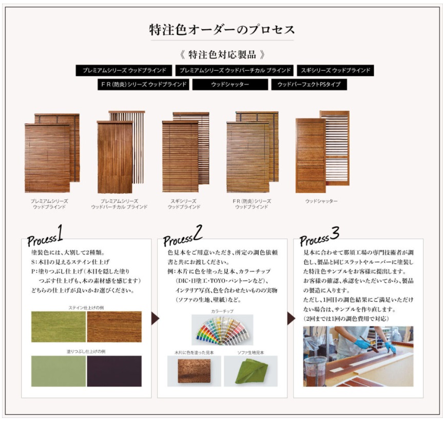 ナニック「ウッドバーチカルブラインド」では、バスウッド材を使用した『プレミアムシリーズ』(73色展開)で使用している色成分の組合わせ範囲内で「特注色を調色し製品化するオプションを用意しています。