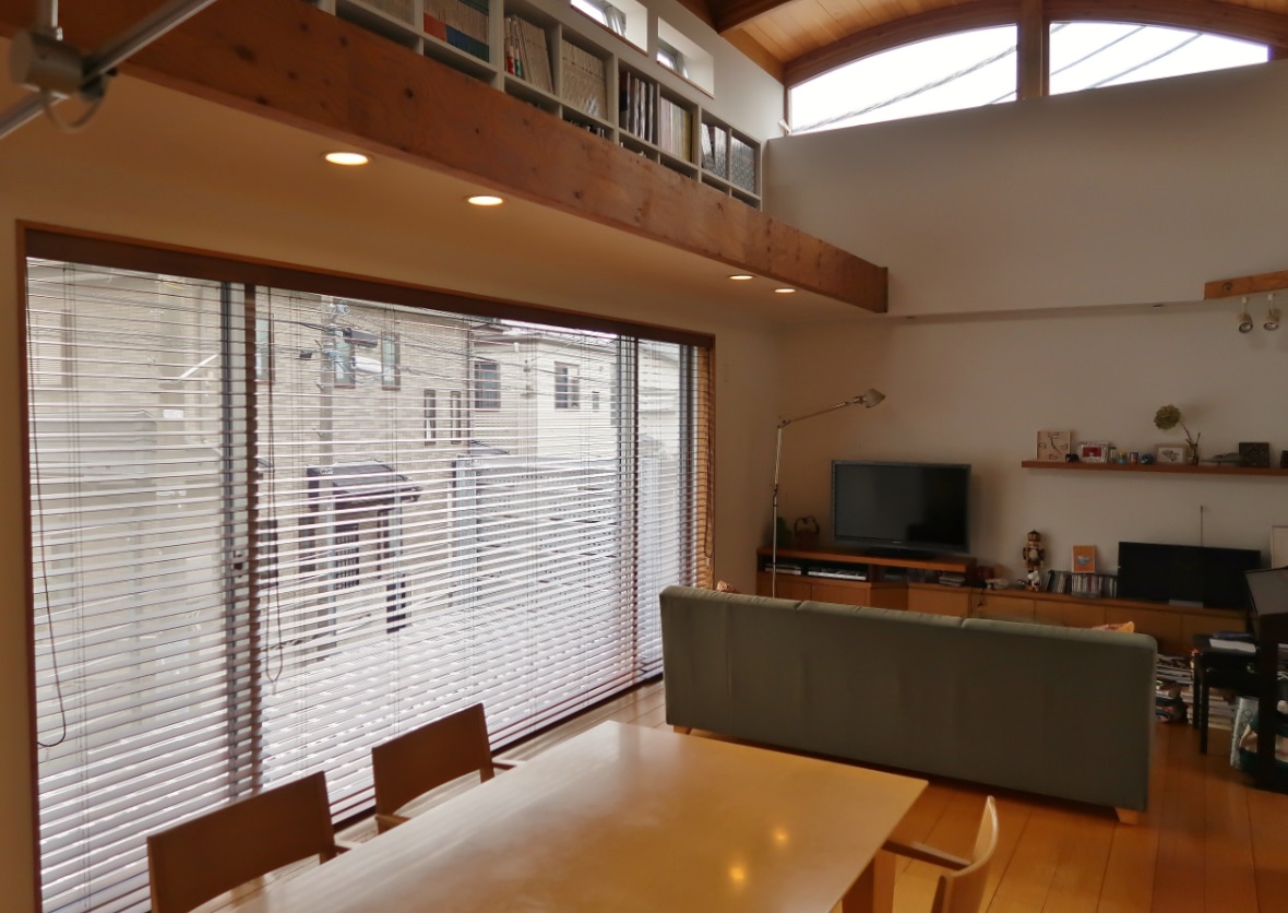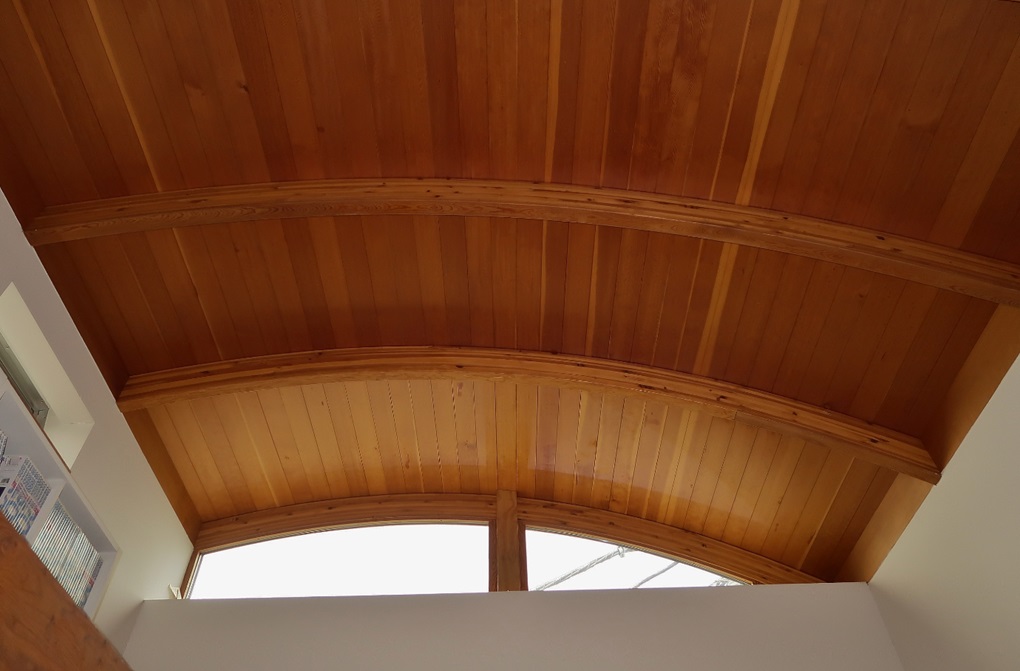 板張り・「アール天井」とウッドブラインドの調和。