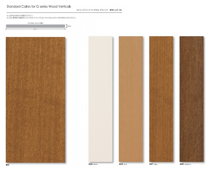 ナニック・『Gシリーズ・ウッドブラインド』のカラーバリエーションは4色で、90mmのルーバーは製作高に応じて分割される「ヒンジ式分割型」となります。