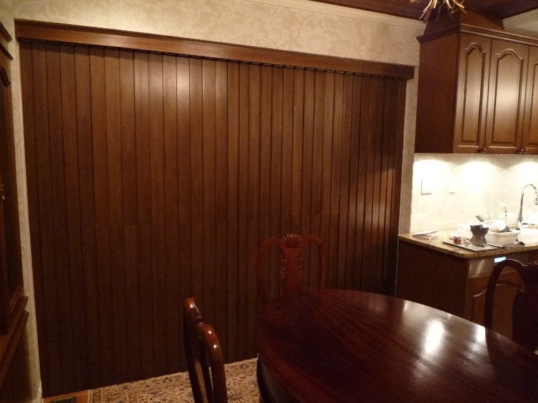 こちらは、実際に納めた納品後の様子、採用カラーは「Gシリーズ」ウッドバーチカルブラインドの展開色よりウォルナットです。