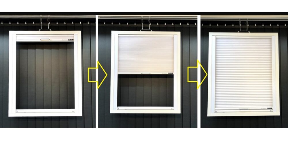 生地の組み合わせは、「ハニカム不透明・遮光」 + 「ハニカム シースルー」と「ハニカム不透明・遮光」 + 「プリーツ シースルー」の2種類からお選びいただくことができますが、シースルーのハニカムセルを使った組合せでは、防炎加工の対応がないことと、製品製作面積の上限が4㎡までに制約されてしまうため、防炎対応があり、製品製作面積の上限が5.5㎡まで対応可能な「プリーツ シースルー」の組合わせで2分割設置のご要望にお応えすることになりました。