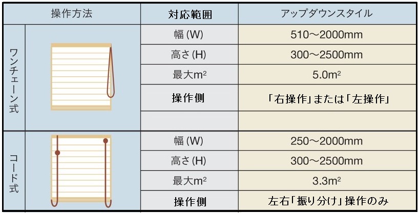 ちなみにコード式のメリットは、ワンチェーン式が対応しないW505mm以下の小窓に対応したコンパクト性(※W250mm~)にありますが、操作コードを左右に振分けた操作方式が悪目立ちし、複数の製品を並べて設置する連窓にも不向きとなるデメリットがあるため、小窓以外での需要が少ない製品となります。