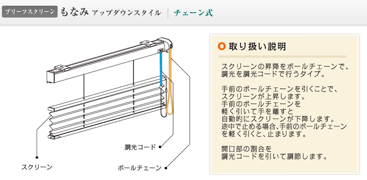 本日ご案内させていただく製品は、プリーツスクリーンでは唯一、スクリーンのトップオープンができる、ニチベイ『もなみ』・「アップダウンスタイル」ワンチェーン式です。