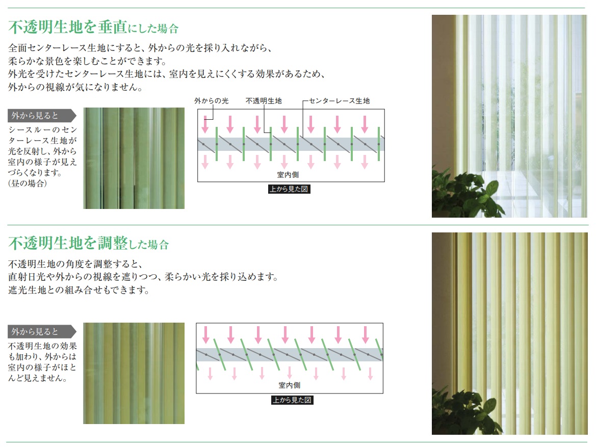 ミラーセンターレースとは、レース生地の裏面に若干光沢のある糸を編みこむことで、光の反射により外からの視線を遮り、日中の室内を見えにくくするシースルー生地で、繊維に含まれる特殊な金属酸化物が日射熱を反射することで、室内の温度上昇を抑える効果もあり、バーチカルブラインドの短所とされていた断熱性の問題点を改善することができます。