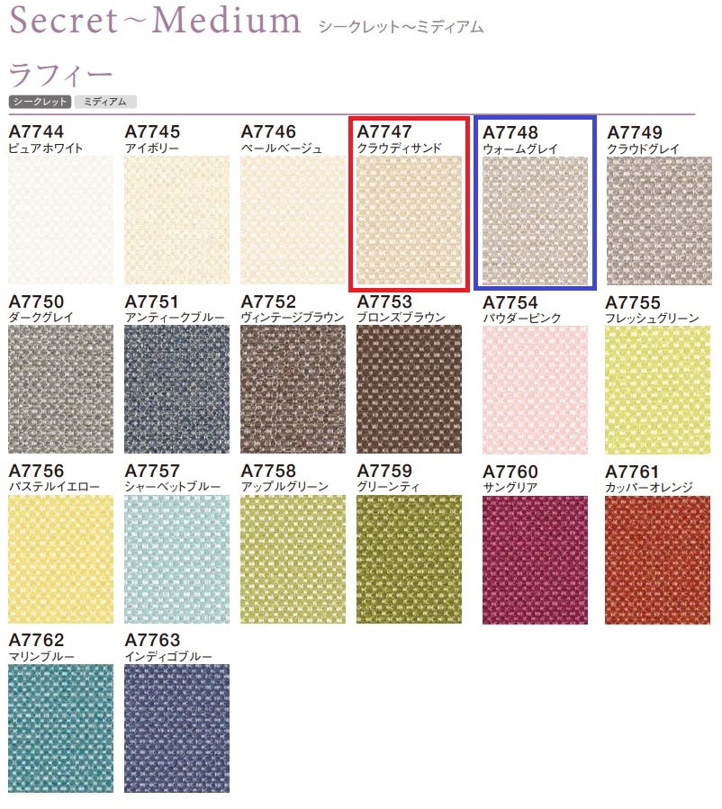 センターレース生地との組合せで、お選びいただいた厚地(不透明生地)は、『アルペジオ』収録の「ラフィ」より、A7747(クラウディサンド)とA7748(ウォームグレイ)の2配色。