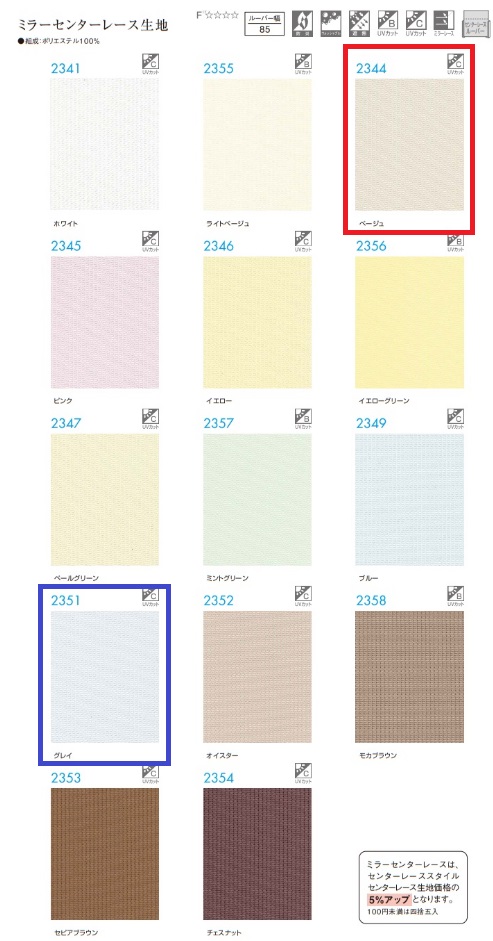 ミラーセンターレースとは、レース生地の裏面に若干光沢のある糸を編みこむことで、光の反射により外からの視線を遮り、日中の室内を見えにくくするシースルー生地で、繊維に含まれる特殊な金属酸化物が日射熱を反射することで、室内の温度上昇を抑える効果もあり、バーチカルブラインドの短所とされていた断熱性の問題点を改善することができます。