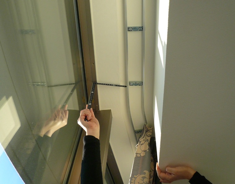 ただし今回、このカーテンBOX内に、『バルーンシェード』、『2.5倍ヒダの裏地付カーテン』、そして『スタイルバランス』という豪華ラインナップのウィンドウ・アイテムを盛り沢山に設置するために、既存のカーテンレールを外して、各アイテムを設置するための割付けを考慮した採寸作業を行う必要がありました。