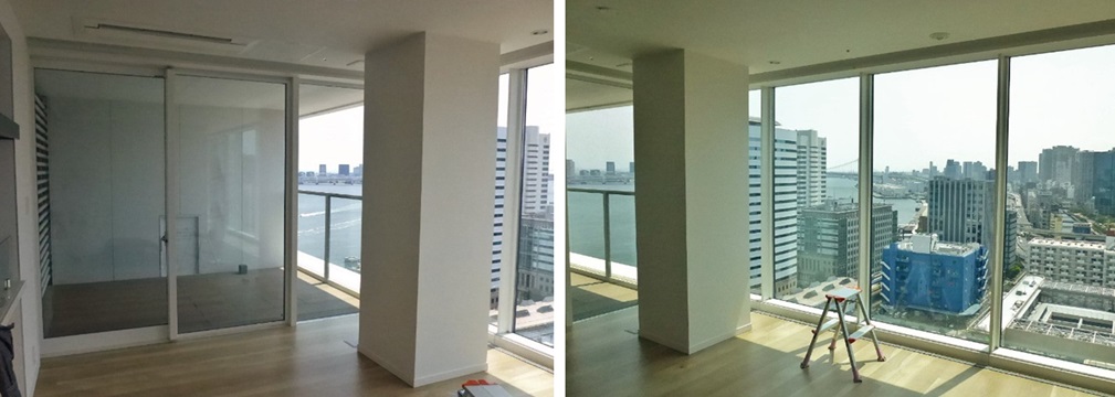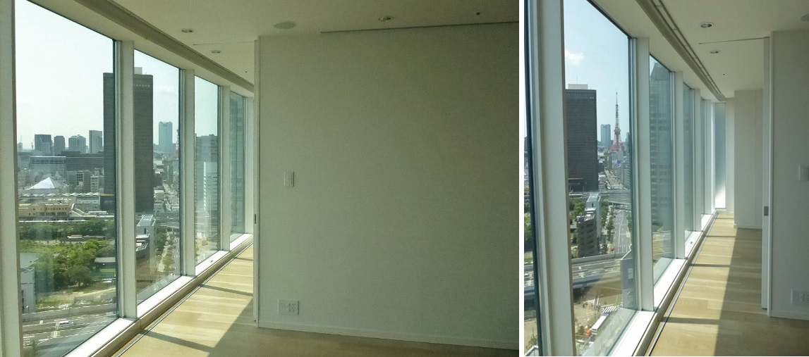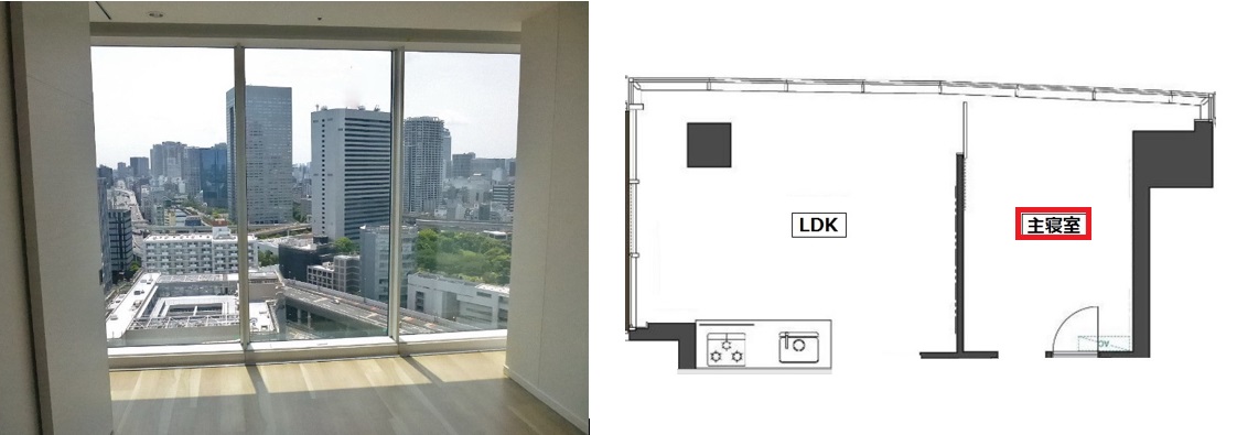 ベッド(枕元)から見えるダイナミックな眺望は、T字型の広がりを持った窓形状であることもあり、横方向の視界の広さに際立った特徴がありました。