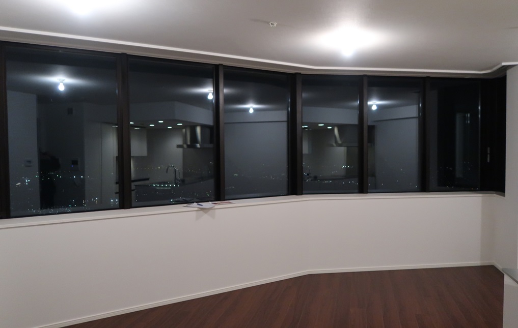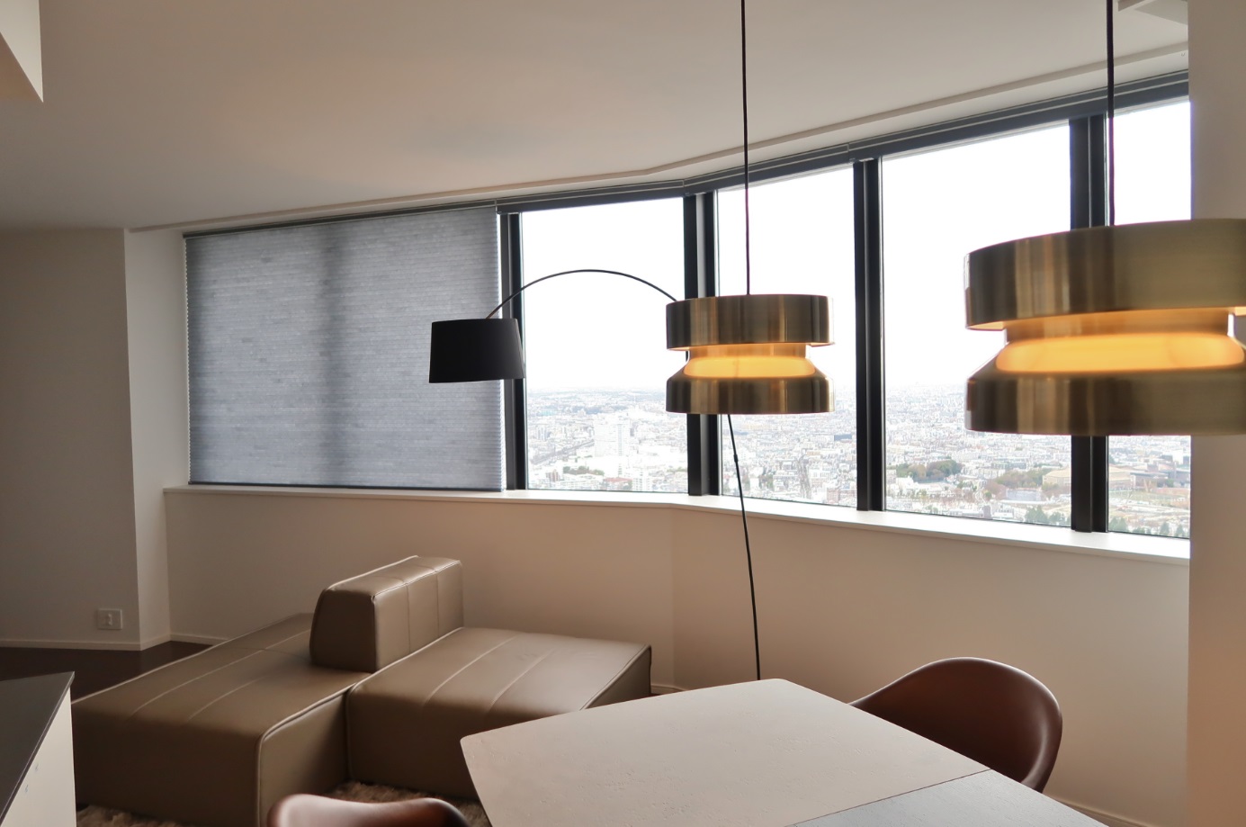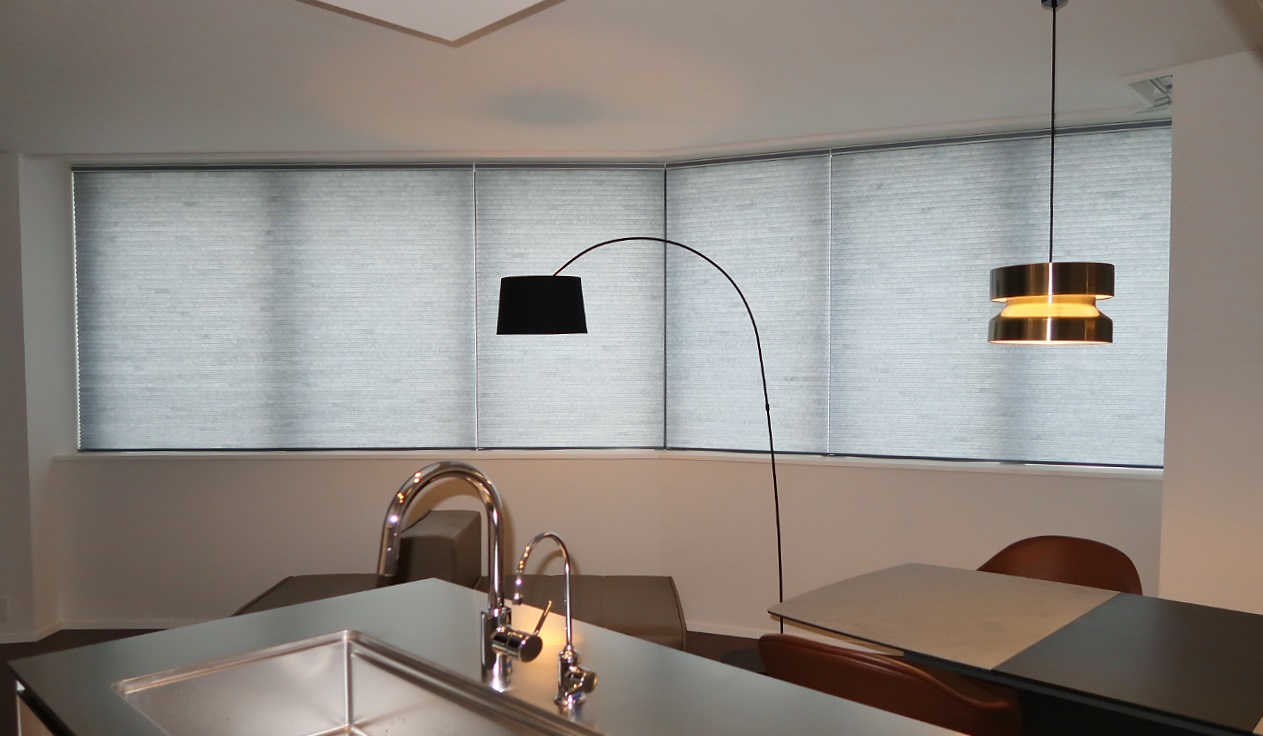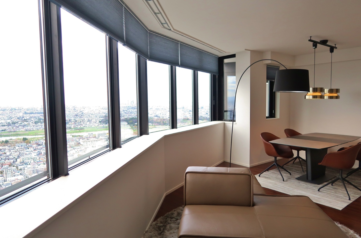 眺望の素晴らしい「高層マンション」上層階の大開口窓に、ルーセントホーム『シェルシェード』の「電動リモコンタイプ(電池式)」を4分割で納品させていただきました。