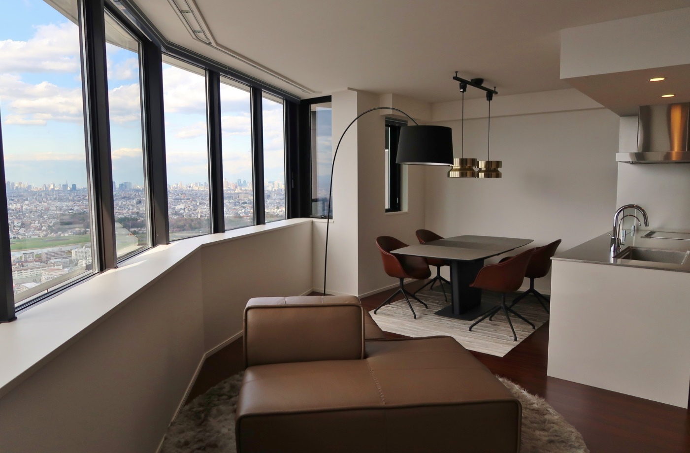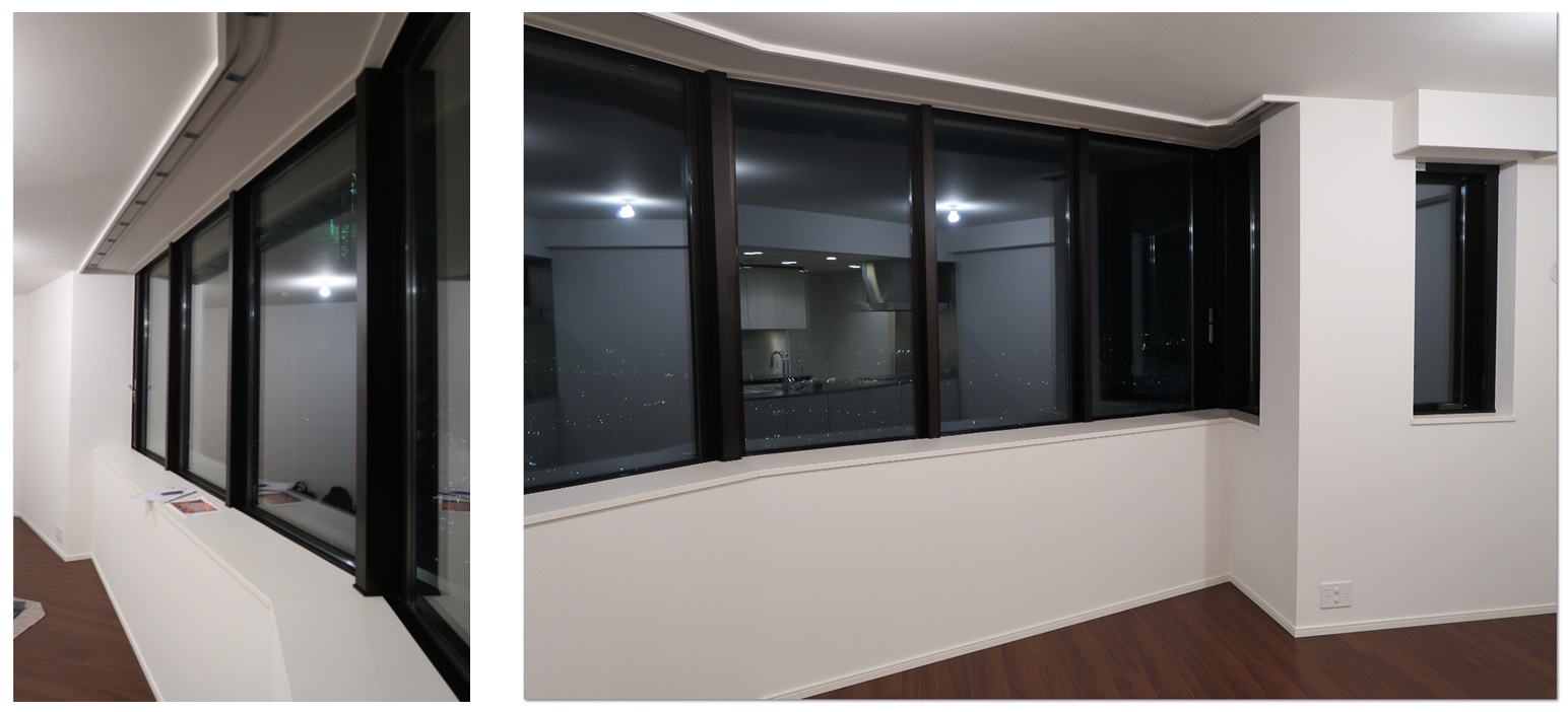 幅6mを超える、6枚サッシからなるFIX出窓は、カウンター付の立派な意匠で、中央が少し屈折しているため、よりパノラマ度の高い眺望を楽しめる形状になっていました。