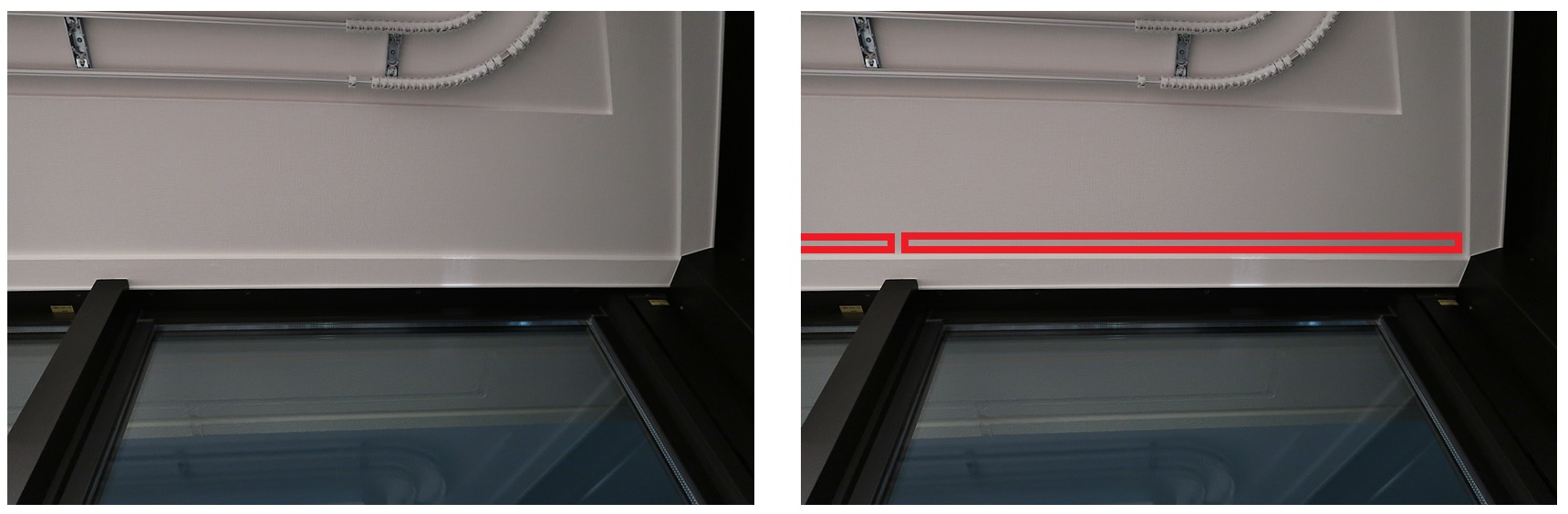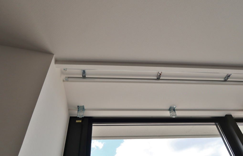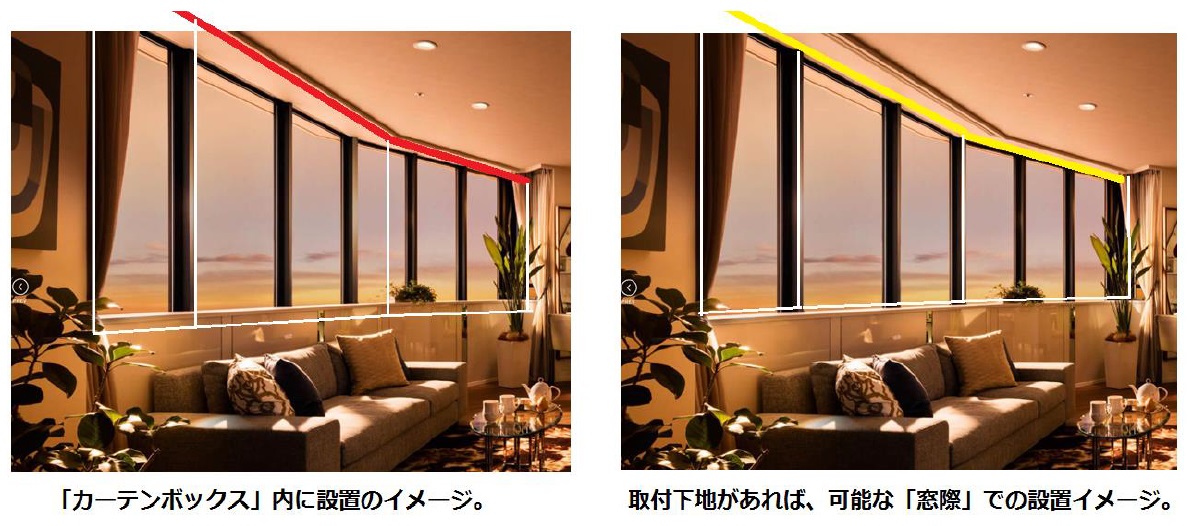 近年のタワー型マンションでは、窓周りに対する多用なニーズに配慮して、この様な形状のカーテンボックスの背面には、「ロールスクリーン」、「各種ブラインド」、「ローマンシェード」などに代表される昇降型製品が設置できるスペースと下地が用意されているケースが多く、お客様に事前確認をいただいたところ、やはり設置用の下地が用意されていることが判りました。