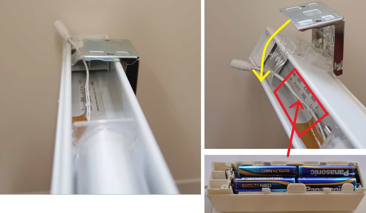 シェードが降りた状態で電池が切れると電池交換が難しくなるため、余力のあるうちに一度完全に引き上げてから電池交換を行います。