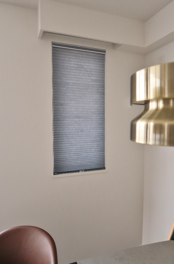 カウンター付窓に隣接する、ダイニング側窓には『シェルシェード』コードレスタイプをご採用。