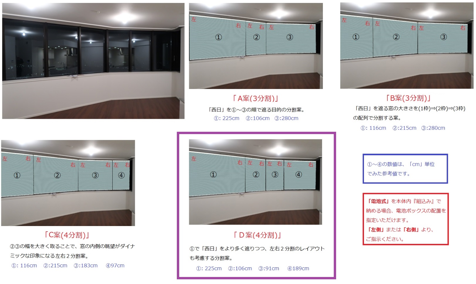 6枚サッシからなるFIX窓での分割については、効果的な「西日」対策やその他諸々のご検討いただき、結果的に左右に幅広の製品を配置させる4分割案をご採用いただきました。