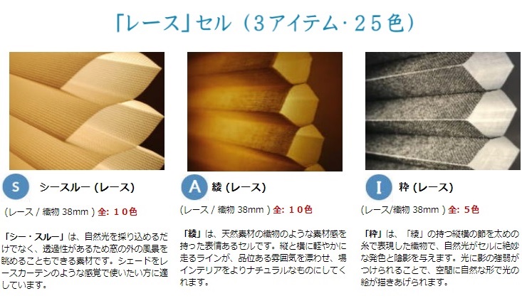 ルーセントホームの『シェルシェード』では、ハニカムシェードを希望されるお客様の希望に応じて多様な機能と表情を持つセルをご用意しており、電動タイプとの組み合わせも可能です。