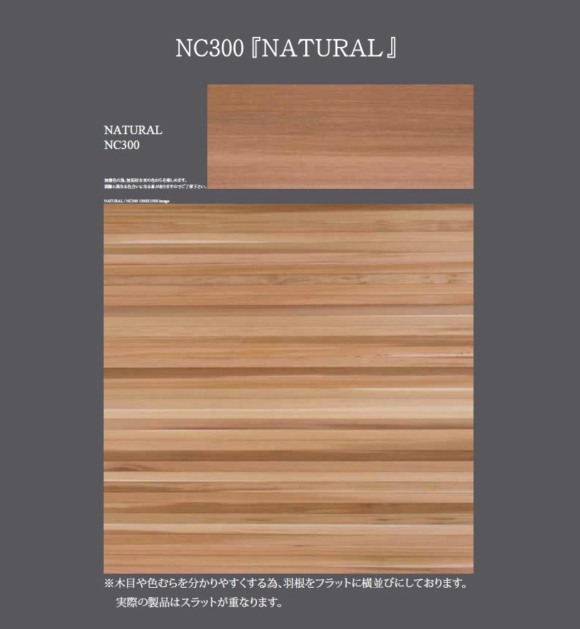 NC300のスラットは、ウエスタンレッドシダー(WRC)本来の素朴な素地を感じていただくために、あえて色艶を加えず「UVクリア塗装(ツヤ消し)」で表現しています。
