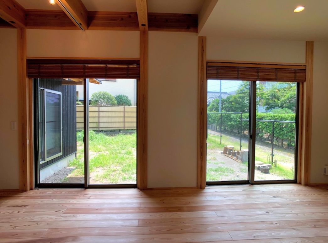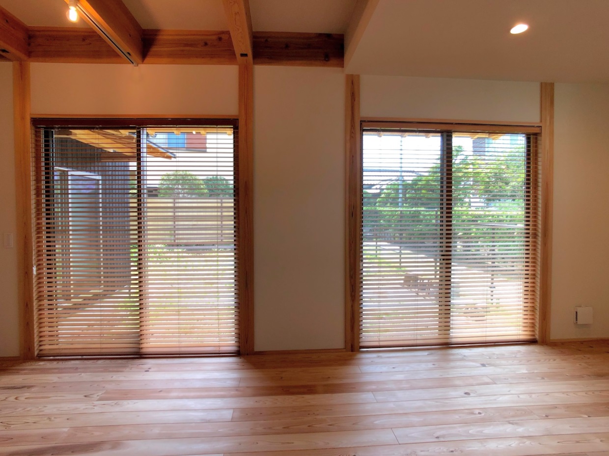 和風住宅の居間に、カナダ産・「ウエスタンレッドシダー(WRC)」材が持つ繊細な木目と表情豊かな濃淡が魅力のJBS・ウッドブラインドをご採用いただきました。