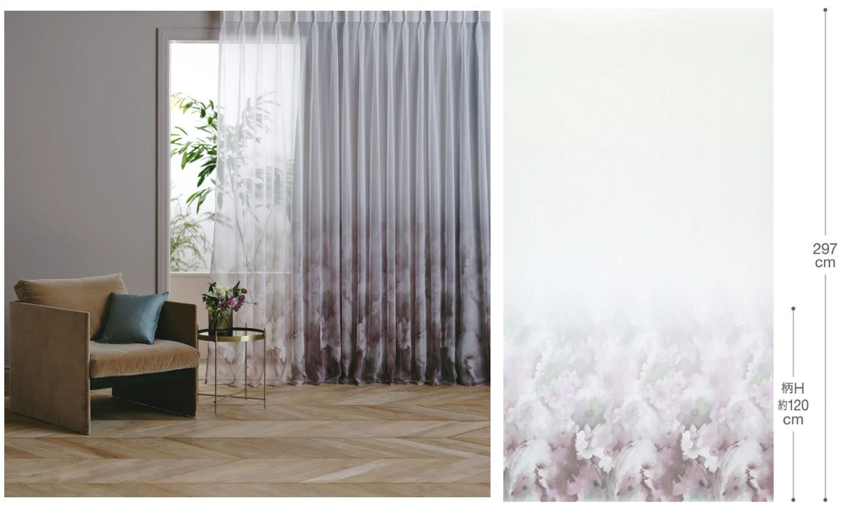 『マイア 4』は、やわらかなボイル地の裾部分に、印象派のような水彩調で花のモチーフをデジタルプリントした、大人の雰囲気を持つロマンティックな広巾シアー生地です。