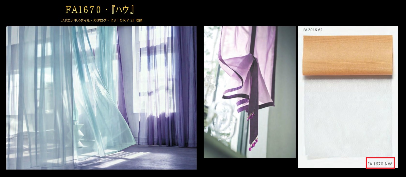 今回、シースルーのレースにご採用いただいたのは、フジエテキスタイルの人気のカラーボイル、『ハウ』FA1670より、自然でクリアな質感を楽しめる(NW)色。