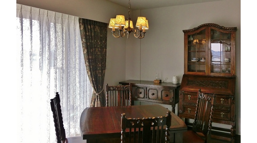 ご購入にあたり、僅かに光沢感のある「織物カーテン」と、低光沢の「紙系壁紙」を組み合わせて使う場合、お互いの「色調や素材感」の相性はどんなものだろう(?)、とのご相談をいただきましたので、実際に展示品にファブリックを合わせてご確認いただきました。