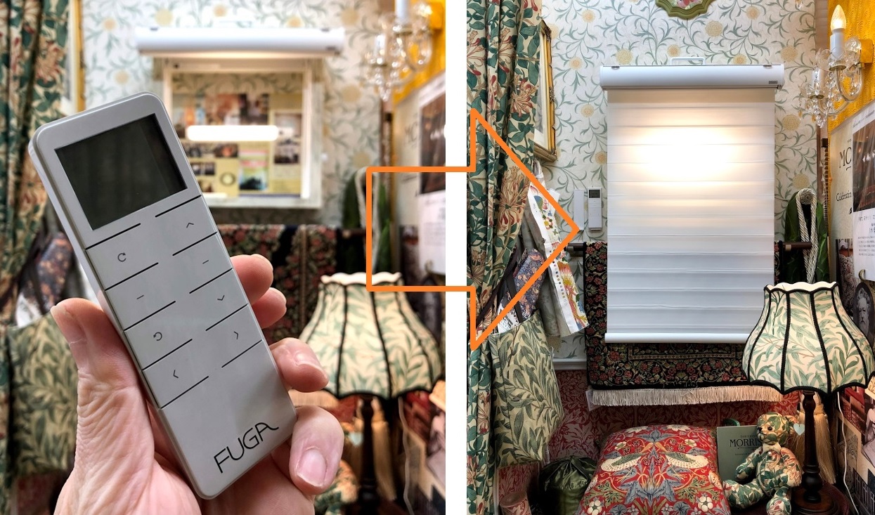 製品の形状は手動タイプと同一で、手動と併せて部分的に電動を使いたいといった導入シーンにも対応しており、今回も手動製品と併せて電動のサンプルを現地お打ち合わせ時に持参して実際の窓辺でご覧いただきました。
