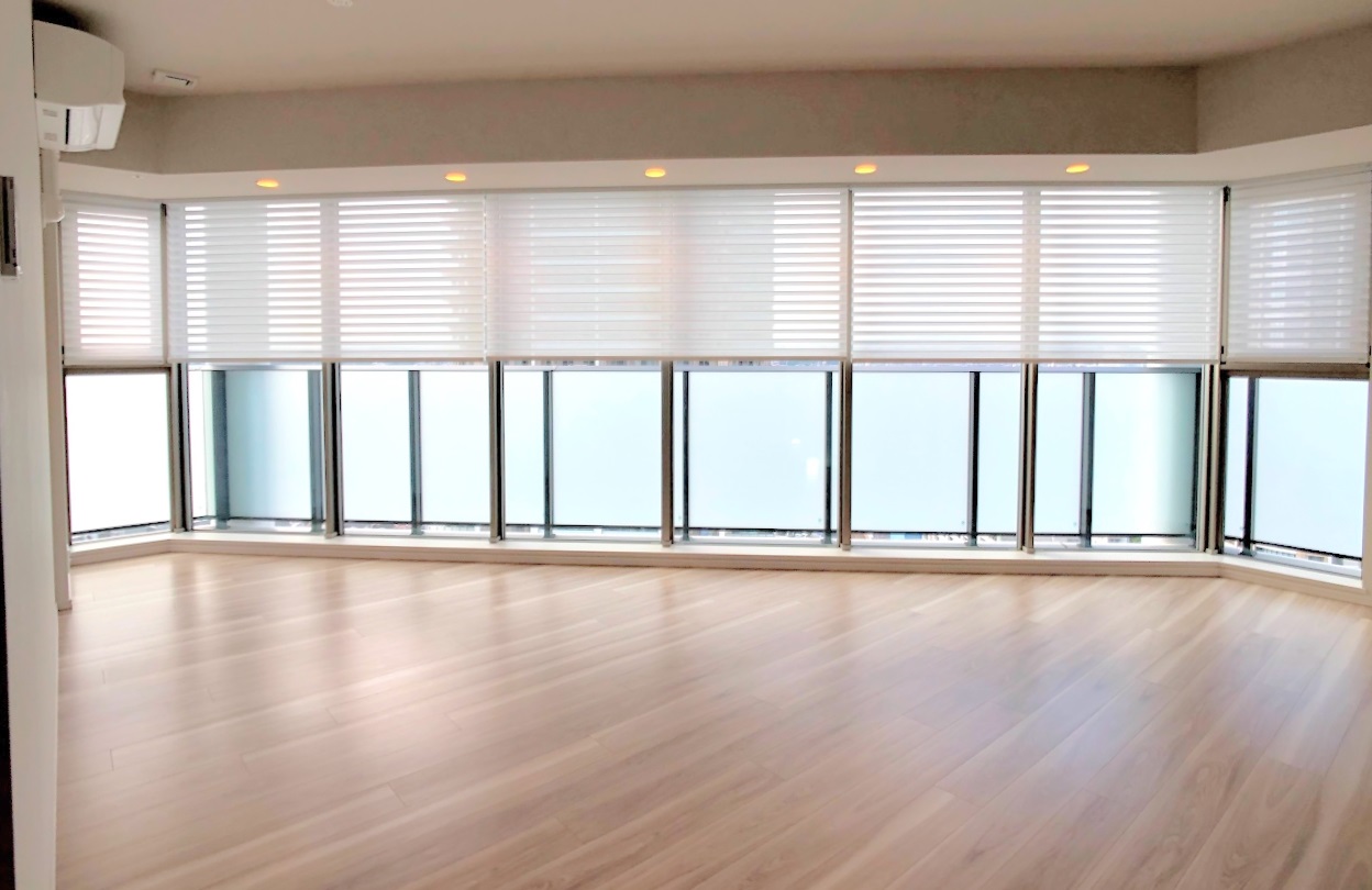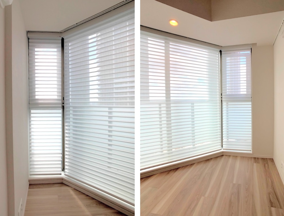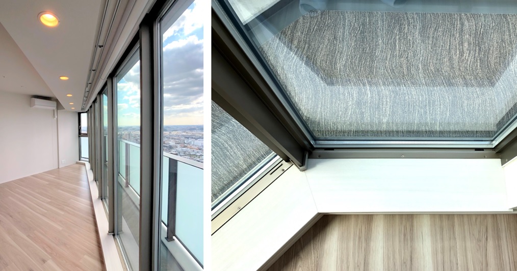 お知り合いの紹介で、調光ロールスクリーンの存在を知ったというお客様から、眺望の良い高層マンション大開口窓で、適度な西日対策を講じながらベイ ウィンドウ周りををすっきりと納められる電動の調光ロールスクリーンを採用したいというご相談をいただきました。
