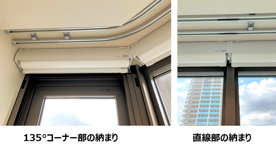 マンション・角部屋の窓形状は、その特徴を活かして眺望を重視した大開口窓になっている場合が多く、オーソドックスな90度のL字窓や、入隅と出隅が組み合わさったクランク窓、45度の倍数である135度の角度が付いた屈折形状や台形窓、更には45度の倍数に当てはまらない多角形窓になっている場合もあり、以下はそれらの窓を調光ロールスクリーンで納めた場合の一例です。