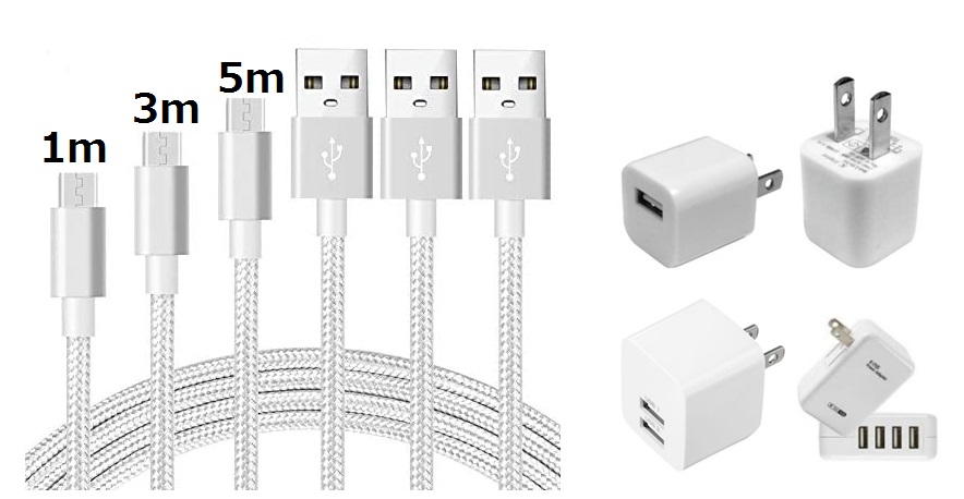 市販のUSBケーブルは0.3m以下から最長5mまであって、電源環境に応じて最適なケーブルを用意しますが、複数ケーブルと複数ポートの充電に対応したアダプター充電器を別途用意することで充電頻度をまとめることができます。